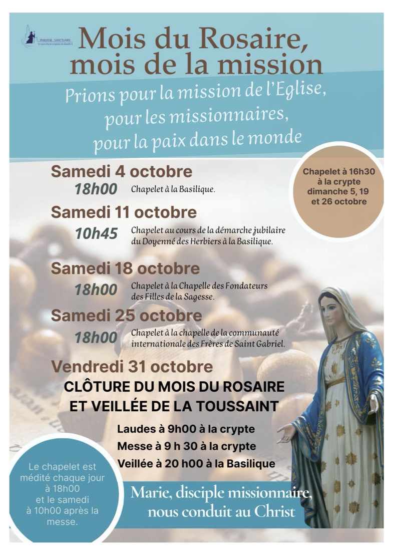 Intention : Prier pour la mission de l’Église et pour les missionnaires (en particulier : la mission et les missionnaires de notre paroisse-sanctuaire) et pour la paix dans le monde.